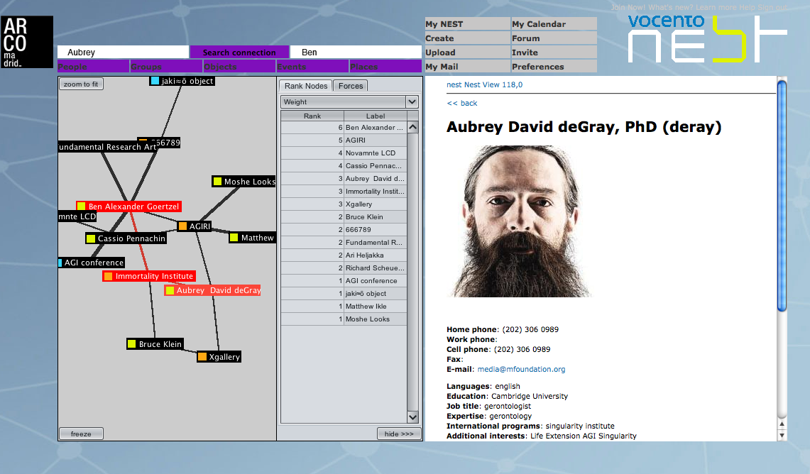 GenesisCounterterrorism programs Los Alamos and The DARPA program like TIA. TIAa prototype system to provide tools to better detect, classify, and identify potential foreign terrorists with the goal to increase the probability that authorized agencies of the United States could preempt adverse actions.It will link items relating potential terrorist groups or scenarios, and learn patterns of different groups or scenarios to identify new organizations or emerging threats.Analyzing Entities is the ability to search, identify, match, and research entities across aliases and other obfuscating events and tactics.AccessTo work with Graph, to make contributions you will need to register as a user, or as we say, as an NUser (N here can mean Nest, Nest of concepts, Nest of galleries, artists and specialists etc). You are an NUser if you were accepted by any member of NEST Council. If you have agreement from NEST Council you become a NUser simply by registering and giving yourself a Handle, like you would do when signing in for an e- mail account. The details that you write about yourself create an NUser Profile - where visitors and other NUsers can find out what you want people to know about yourself. As your participation in NEST grows, this page will also feature links to the Projects and experiments that you initiate or contribute to. Becoming an NUser gives you access to certain other privileges as well. You get regular updates on what is new in NEST. If you are going to get access and test NE5T please use following mail: nestcouncil at fundamental dot art dot plPresentationNE5T ARCO Art Fair Madrid, February 11 ? 16, 2009 TeamFundamental Research Labhttp://www.lisek.art.pl head of the project: Robert B. Lisek coding: Robert B. Lisek, Szczepan Kuzniarz, Rafal Kozlowski, Piotr Mlodzianko, Krzysztof Lukasik